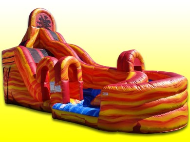 Another unique water slide, the Fire Mountain is styled using orange and red marble vinyl and offers two sliding lanes, one taller than the other. Participants go up the first climb area and can then choose between sliding down a straight lane to the pool, or continue climbing to a second lane that curves at the end of the unit into the pool.